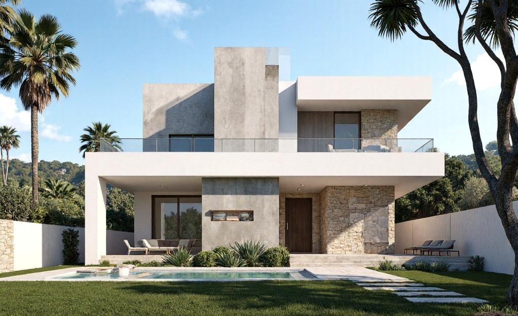 Diseñada para una familia joven que buscaba amplitud y luminosidad, Villa Horizonte se erige en una parcela de 600 m² con vistas despejadas hacia la sierra. Su arquitectura combina líneas rectas, volúmenes cúbicos y amplios ventanales que conectan el interior con el jardín.