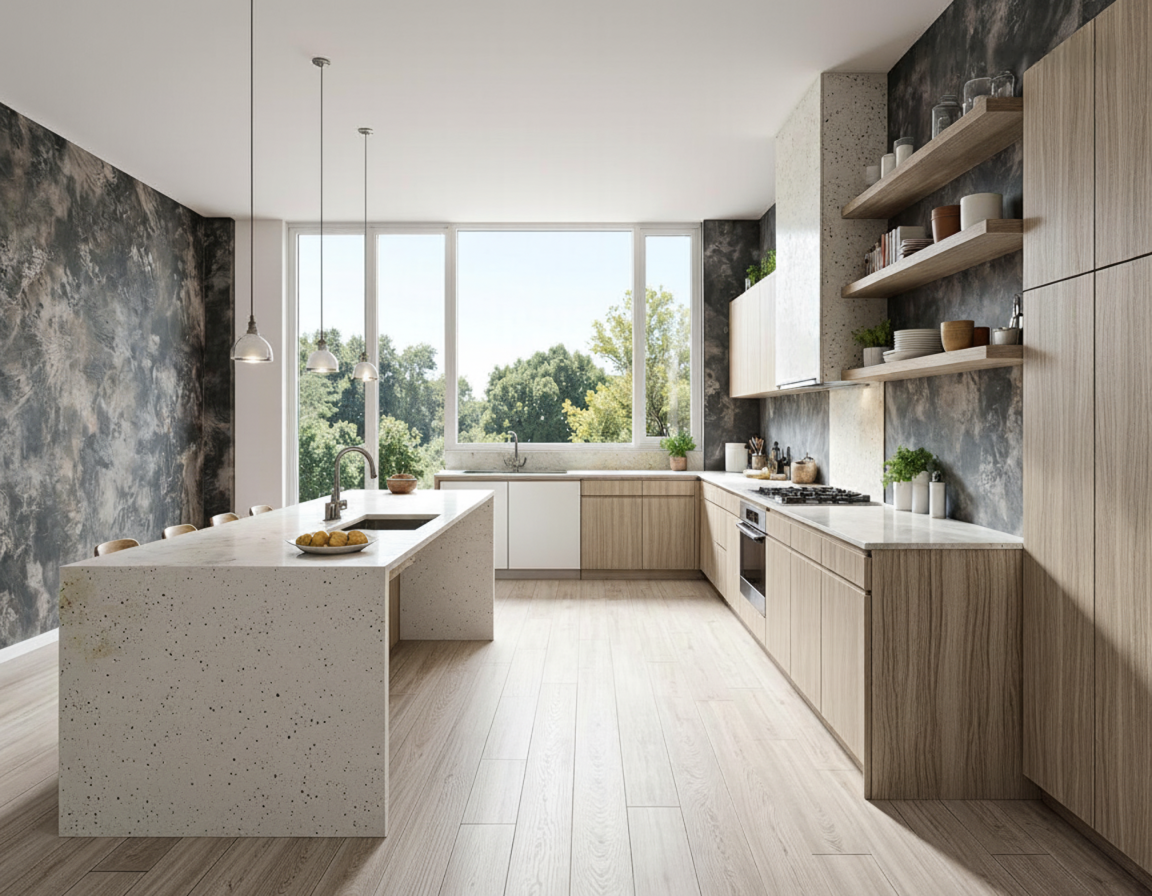 El sistema constructivo en madera industrializada EcoFrame permite grandes luces sin pilares intermedios, creando un salón-comedor de más de 50 m² totalmente abierto. La envolvente de fachada en tonos grises y madera natural aporta equilibrio entre modernidad y calidez.
